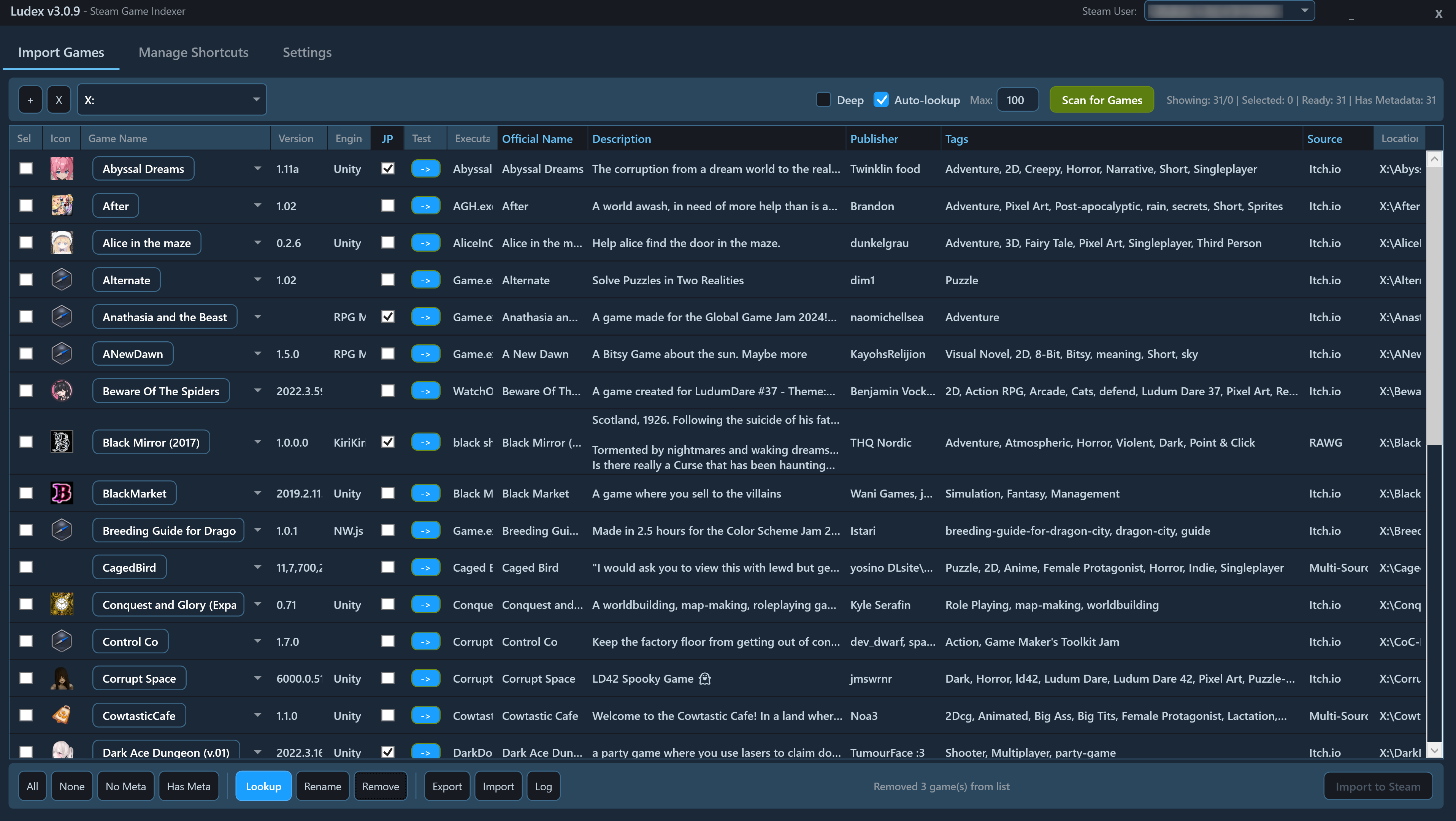 Automatic Metadata Lookup Stop manually entering game info. Ludex fetches titles, descriptions, developers, and tags from multiple sources: